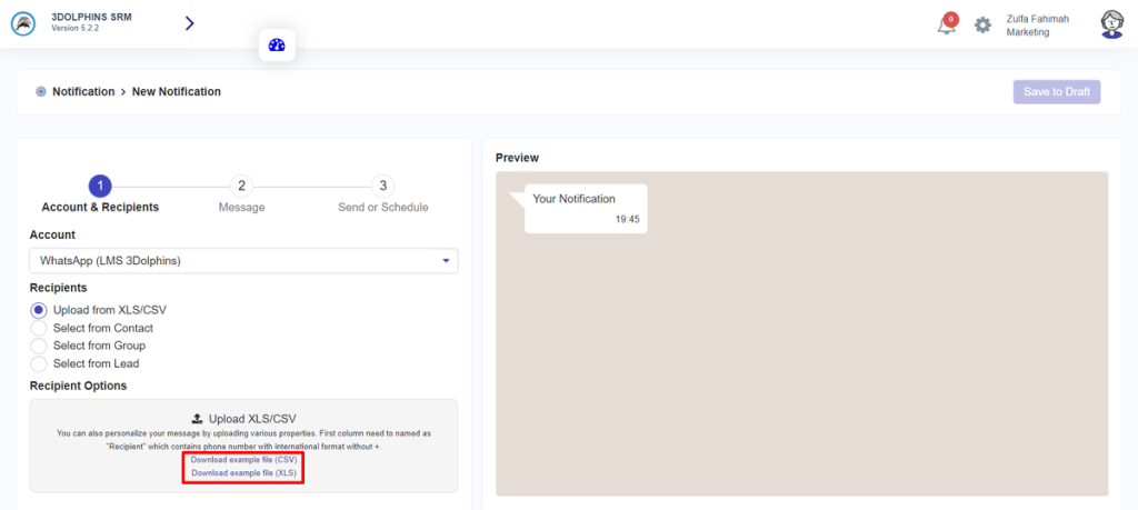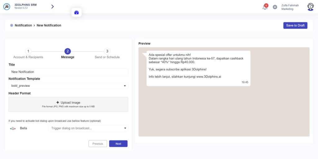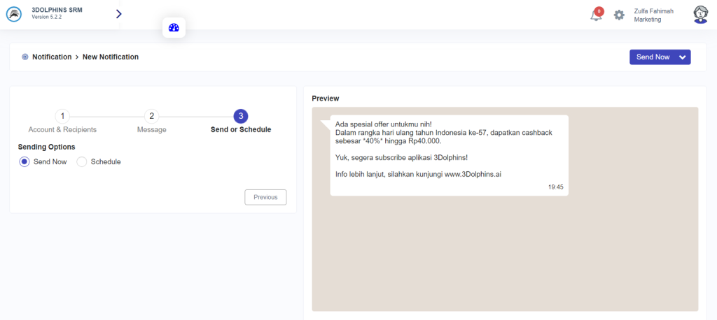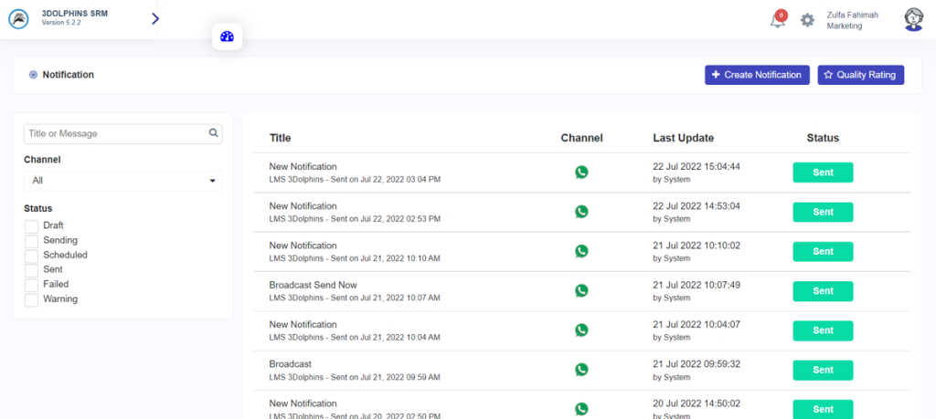 Pesan blasting WA dari 3Dolphins terletak pada dashboard Marketing SRM melalui menu bernama “Notification”. Fitur ini mengizinkan bisnis untuk mengirim pesan broadcast ke audines, baik itu informasi, promosi, dan sebagainya.