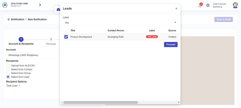 Terakhir, pesan blasting juga dapat dikirim ke pelanggan potensial yang sudah berada pada laman leads. Opsi “Select from Lead” adalah langkah mudah yang dapat langsung menampilkan beberapa leads yang dapat disesuaikan.