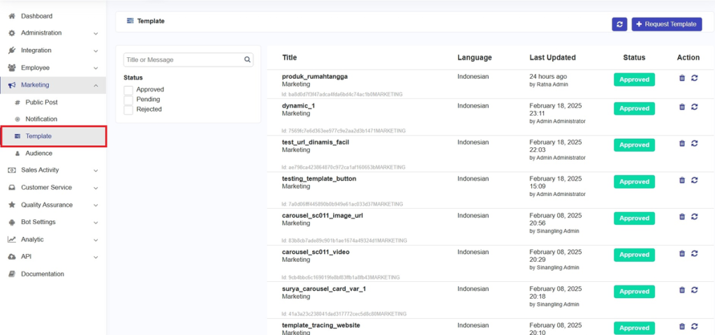 Setelah mendapatkan akses ke WhatsApp Business API, bisnis dapat mengakses laman untuk meminta OTP di dashboard melalui menu Template. Di menu inilah, bisnis dapat menemukan template untuk mengirim OTP dengan pesan pembuka yang disesuaikan.