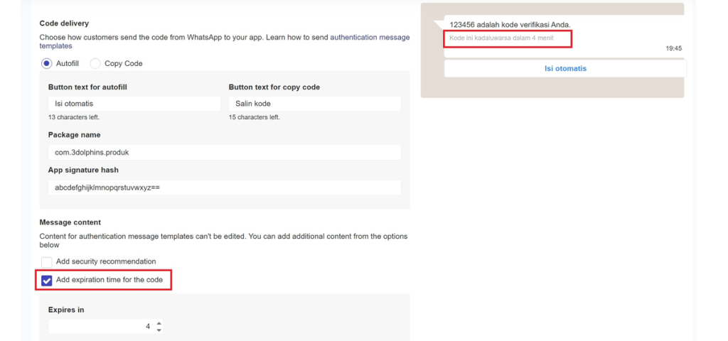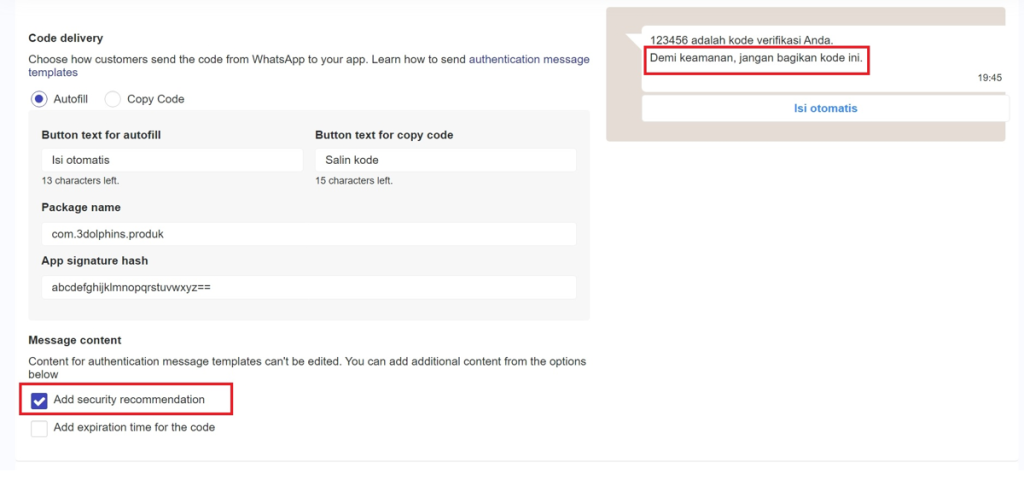 Selanjutnya, bisnis dapat mengatur isi pesan yang akan dikirim bersamaan dengan kode verifikasi. Pesan tersebut sudah diatur melalui WhatsApp dan tidak bisa diubah. Namun, ada pilihan untuk meningkatkan keamanan dan membuat pesan lebih jelas dengan cara berikut.
