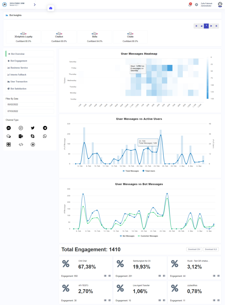Dengan adanya dashboard tersebut, bisnis dapat menganalisis banyak metrik, termasuk fallback, engagement, pesan dari bot dan pengguna, serta metrik penting lainnya secara otomatis dan terpusat.