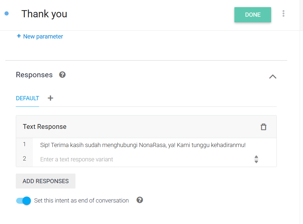 Agar percakapan terasa selesai dengan baik, kamu bisa membuat intent khusus seperti “Terima Kasih” atau “Akhiri Percakapan”. Ketika pelanggan menulis “makasih”, “oke sip”, atau “bye”, bot bisa membalas dengan respons penutup agar chat berakhir dengan hangat, tetap menjaga tone restoranmu, dan membuat pelanggan nyaman kembali.