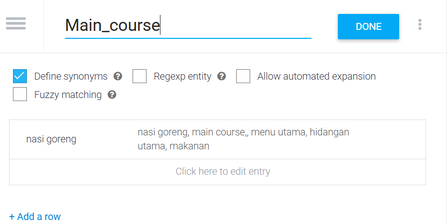 Agar chatbot terasa lebih cerdas, pengguna dapat menambahkan entity untuk item-item tertentu. Misalnya, entity untuk jenis makanan: minuman, dessert, main_course, atau bahkan nama menu tertentu seperti nasi goreng, milk tea, dan sebagainya.