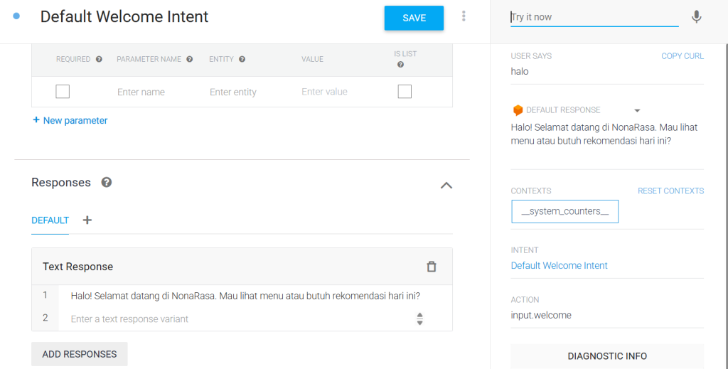Begitu agent terbentuk, dua intent penting sudah tersedia, yakni Default Welcome Intent dan Default Fallback Intent. Di industri F&B, Welcome Intent dapat diubah menjadi sapaan ramah seperti “Halo! Selamat datang di NonaRasa. Mau lihat menu atau butuh rekomendasi hari ini?”.