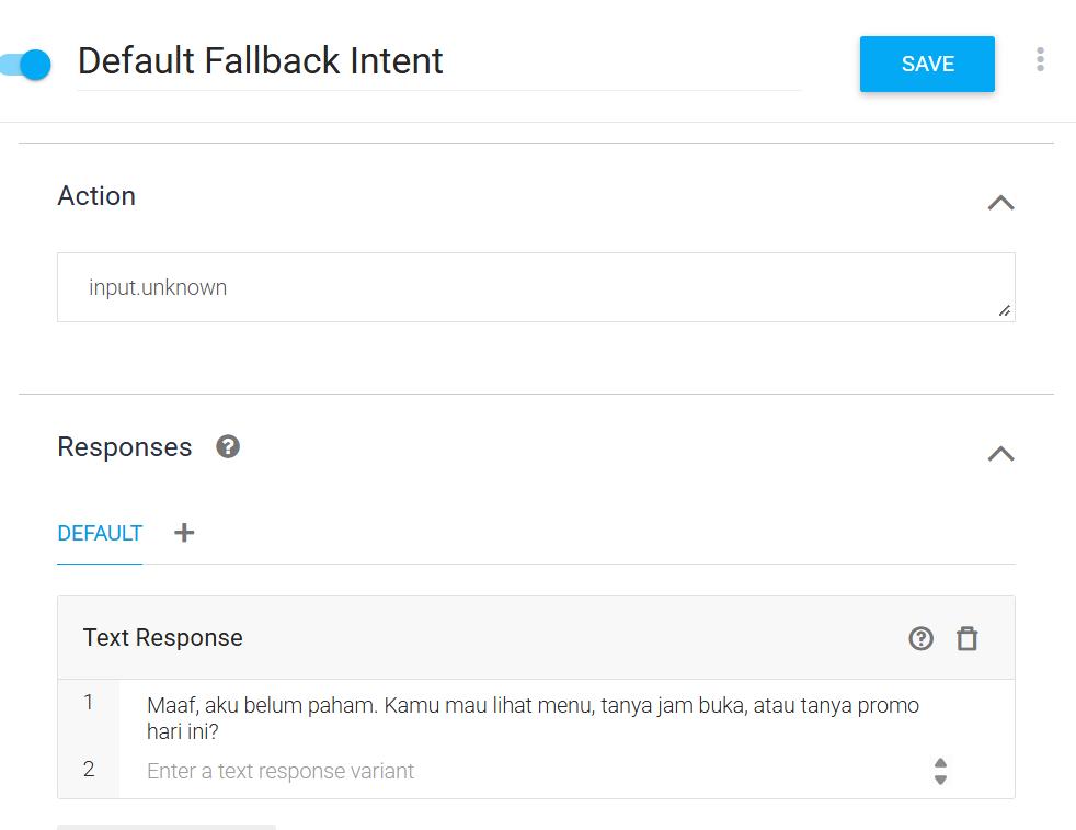 Fallback Intent tetap perlu ada agar chatbot tetap bisa menanggapi ketika pengguna bertanya hal yang belum dikenali, misalnya “Maaf, aku belum paham. Kamu mau lihat menu, tanya jam buka, atau tanya promo hari ini?”. Dengan dua intent dasar ini, percakapan akan tetap berjalan lancar sejak awal sampai kondisi salah paham.