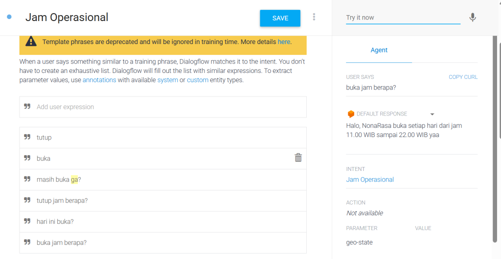 Di tiap intent, contoh pertanyaan pelanggan seperti “Ada menu apa hari ini?”, “Rekomendasi makanan pedas dong”, atau “Restorannya buka sampai jam berapa?”. Dengan begitu, chatbot dapat lebih fungsional seperti layaknya kasir virtual yang mampu menjawab pertanyaan dasar.