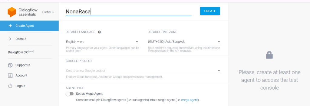 Selanjutnya, agent yang akan menjadi dasar chatbot dibuat di menu ‘create account’ pada dashboard Dialogflow. Detaik nama bot, bahasa, dan timezone dapat lebih dulu diatur untuk membuat bot lebih sesuai.